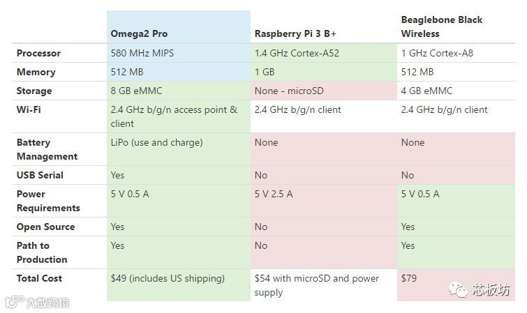 Omega2 Pro与树莓派3B+、BBW功能对比: