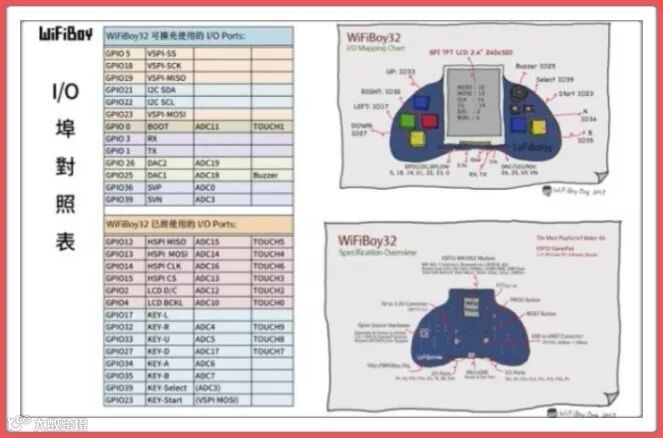 这台游戏机的名字,为了致敬GameBoy,叫做WiFiBoy32。其中,ESP32-WROOM-32模块是乐鑫公司最新开发的物联网模块,支持802.11nWiFi和蓝牙4.2,相信大家已经很熟悉了。游戏机的硬件规格如下: