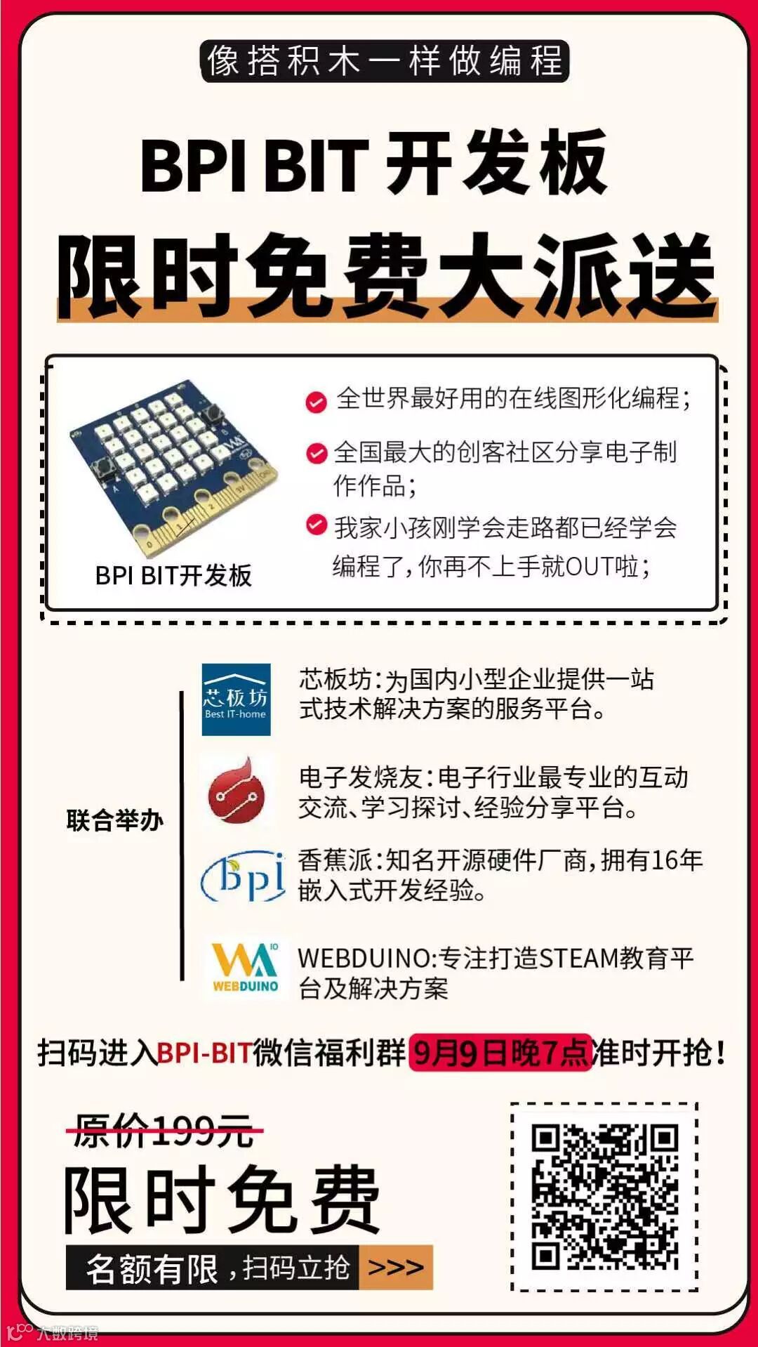 最后2天,扫码速度来免费体验BPI-BIT——全球最好用的在线图形化编程开发板!!