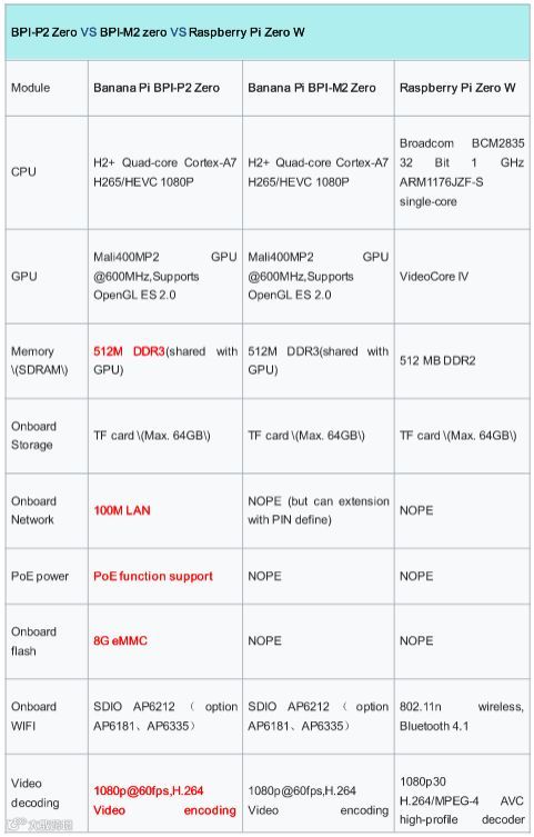 我们把香蕉派P2Zero的具体参数列在下表里。其中,香蕉派M2 Zero和树莓派Zero的参数,作为对比,也给出了参考网络供电摄像头的应用场景,最关键的参数已经用红色加粗标注。