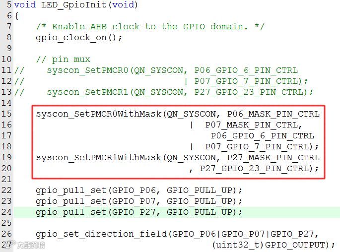 syscon_SetPMCR0(QN_SYSCON_TypeDef *SYSCON, uint32_t value)函数和syscon_SetPMCR0WithMask(QN_SYSCON_TypeDef *SYSCON,uint32_t mask, uint32_t value)函数都是作为设置I/O口功能的函数,但是他们的内容是不同的。