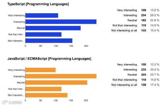 调查发现,TypeScript 和 JavaScript 的关注度基本持平,TypeScript 以 42.8% 微超 JavScript (41.9%)。