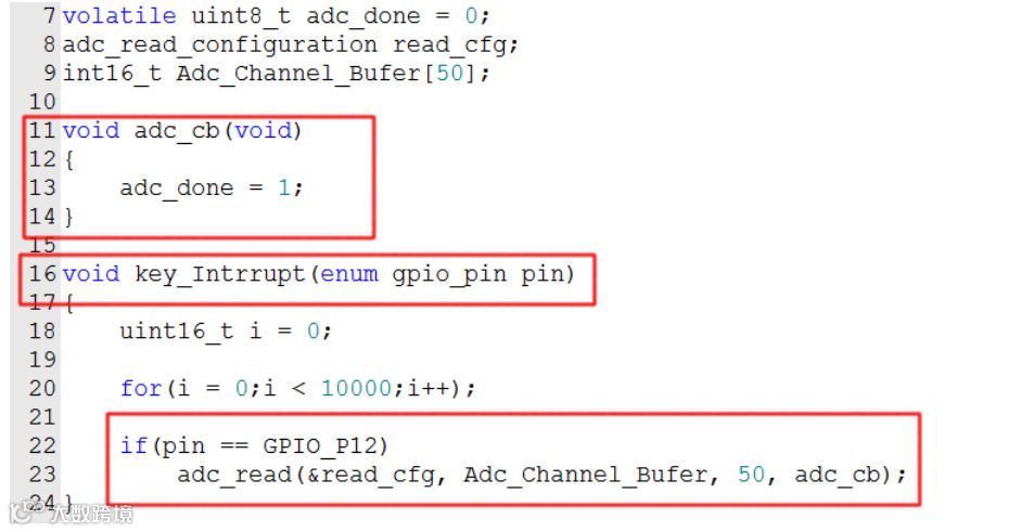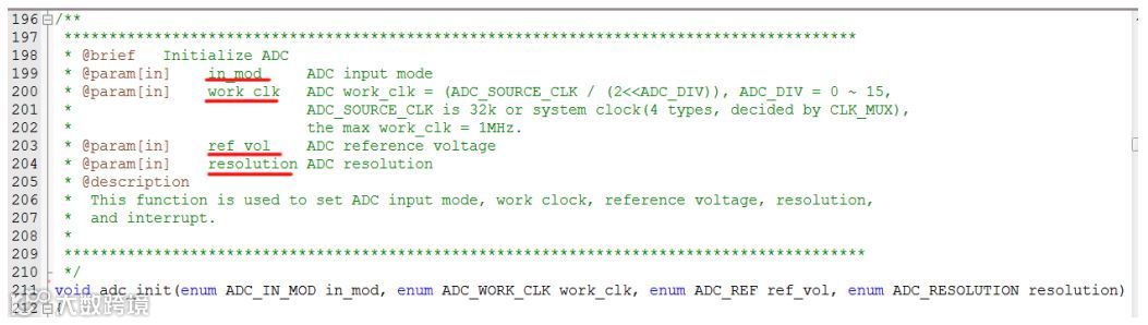 adc_init(ADC_SINGLE_WITHOUT_BUF_DRV,ADC_CLK_1000000,ADC_INT_REF, ADC_12BIT);函数的最后一行代码: