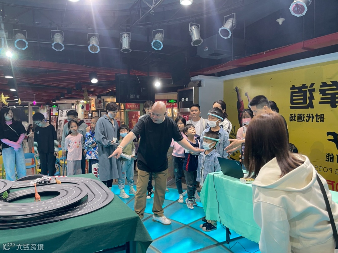 作为孩子最受关注的是脑控赛车----专注力赛车比赛,孩子们排队等待参赛。