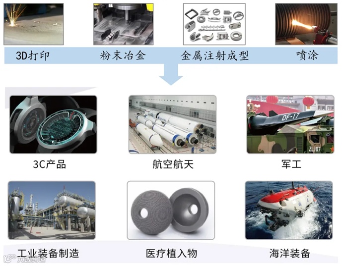 公司再生粉材可直接用于下游传统粉末冶金(PM)及增材制造的民用产品生产,而对于航空航天等氧含量敏感的领域,产品下游钛合金制粉厂商往往会将其再生粉材与新制粉相混合后应用于终端产品制造。