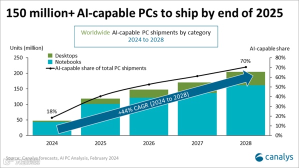 随着消费者对智能设备需求的增加,特别是对高性能、高效率计算设备的需求,AI PC市场呈现出爆发式增长,预计2026年AI PC出货占比超过50%。