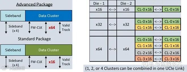 UCIe 支持不同的数据速率、数据位宽、凸块(Bump)间距和通道(Channel)范围,以确保实现最广泛的交互性,详见表1。它定义了一个边带接口,以便于设计和验证。互连的构造单元是一个簇(Cluster),其中包含 N (N = 16 用于标准封装,64 用于高级封装)个单端、单向、全双工数据通道(Lane),一个用于有效的单端通道(Lane),一个用于跟踪的通道(Lane),每个方向一个差分转发时钟,每个方向 2 个边带通道(单端,一个 800 MHz 时钟通道和一个数据通道)。高级封装支持备用通道以处理故障通道(包括时钟、Valid、边带等),而标准封装支持宽度降级以处理故障。可以聚合多个簇(Cluster)来为每个链路提供更高的性能,如图 6所示。