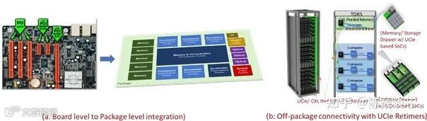UCIe 支持两类被广泛使用使用的模型。一类是封装级集成,以提供高能效和高性价比的性能,如图图 5 a所示。连接在板级的组件,如内存、加速器、网络设备、调制解调器等,可以在封装级集成,适用于从手持到高端服务器,可在同一封装中通过不同的封装选项连接来自多个厂家的芯粒。另一类方式是使用 UCIe重定时器,使用不同类型的媒介(例如,光信号、电缆、毫米波)提供封装外连接,用于在机架甚至POD(性能优化的数据中心)级别传输底层协议(例如PCIe、CXL),以实现资源池、资源共享,甚至使用超出节点级别的load-store语义传递到机架/POD 级别的消息,为边缘和数据中心提供更好的能效和成本效益性能。