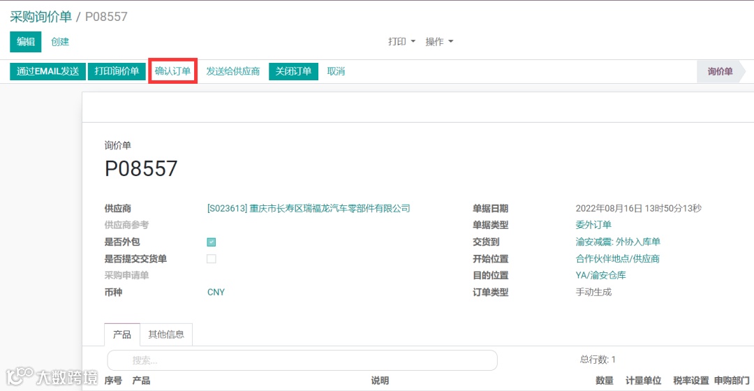 选择并打开一条询价单状态的委外订单,点击【确认订单】按钮,完成委外订单确认工作;