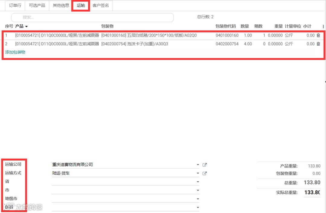 在《运输》视图中修改包装物信息、运输公司相关信息,修订完成后,点击【保存】按钮,完成操作。