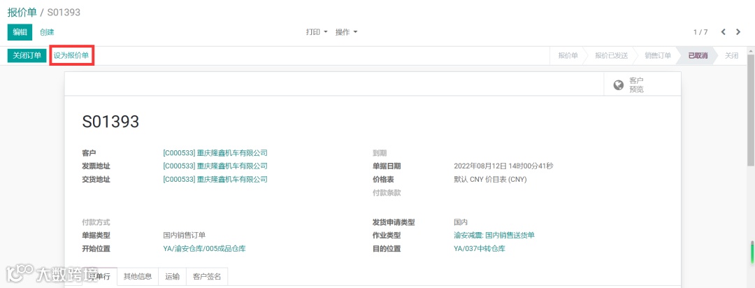 在销售订单表单中,已取消状态下的订单,点击【设为报价单】按钮,将订单重置为草稿状态。