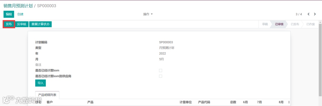 选择并打开一条已审核的销售月预测计划,点击【发布】按钮,完成销售月预测计划的发布。
