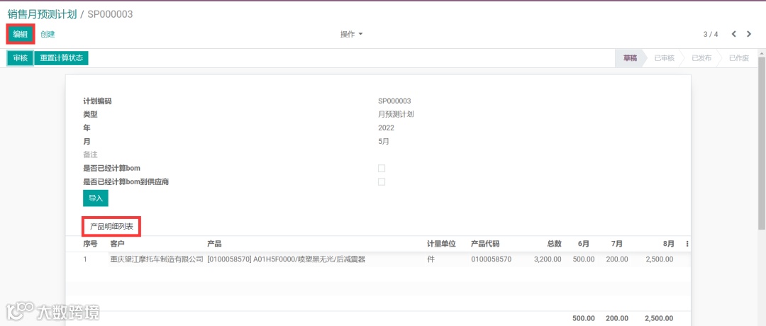 点击【编辑】按钮,在《产品明细列表》中修改相关的客户、产品以及N+3月的数量信息,修订完成后,点击【保存】按钮,完成操作