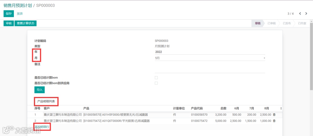 在《产品明细列表》视图中,点击【添加明细行】按钮,选择客户、产品,录入N+3个月的预测需求数量。