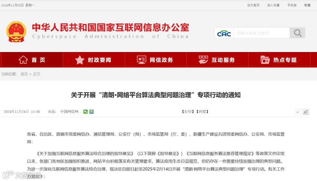 《关于开展“清朗·网络平台算法典型问题治理”专项行动的通知》