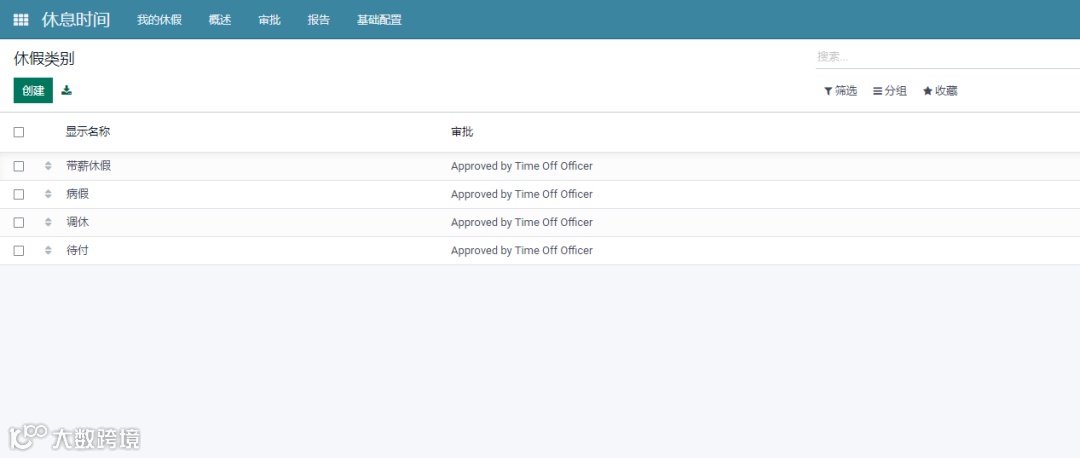 用户可以自定义小欧云平台中可用于公司运营的不同实例的各种休息时间类型,可以从休假模块的配置选项卡访问休假类型菜单,可以修改所述类型,并使用创建窗口创建新的休假类型。