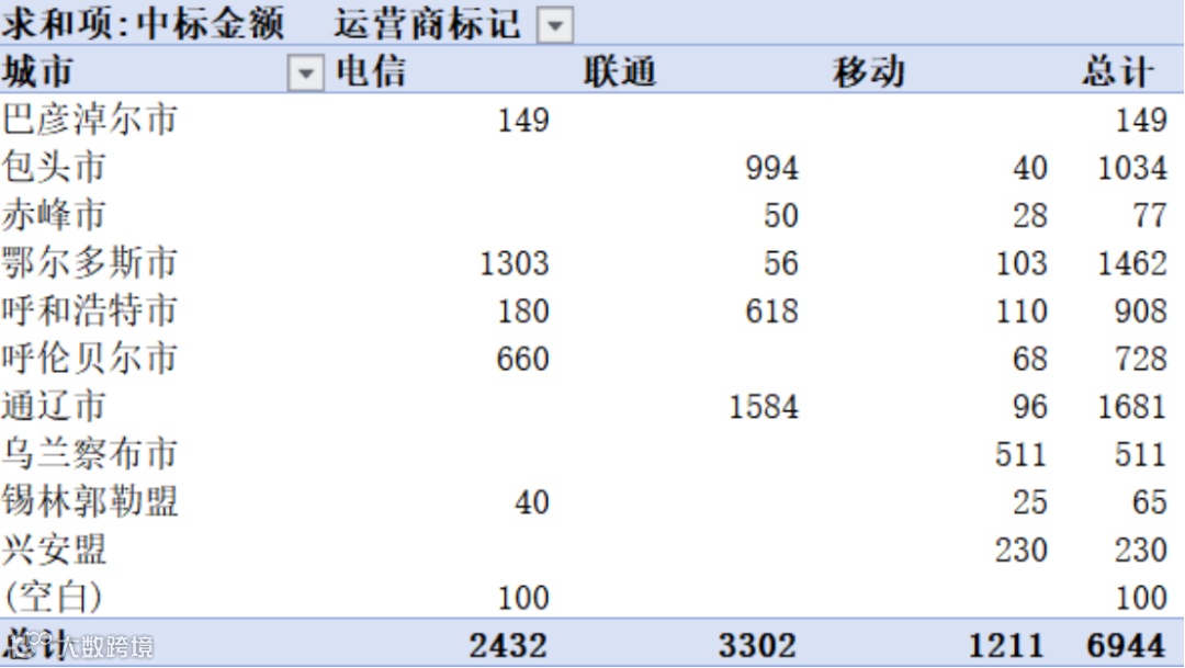 白云鄂博移动(包头市):中标金额11 万元,项目为 “包头市公安局白云鄂博分局互联网接入服务”,金额为包头市最低,仅占本地市场 1% 份额。