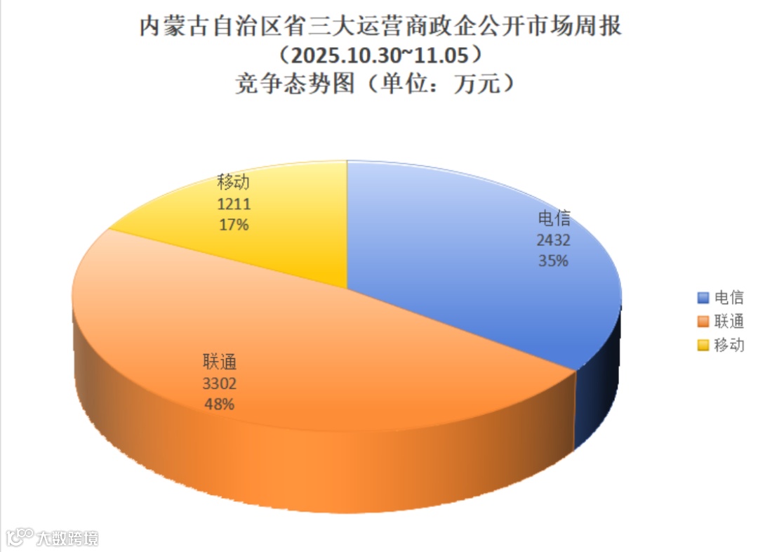 根据2025 年 10 月 30 日 - 11 月 5 日内蒙古自治区三大运营商政企公开市场竞争态势数据(单位:万元),内蒙古联通以 3302 万元中标金额、48% 市场份额位列第一,内蒙古电信以 2432 万元、35% 份额排名第二,内蒙古移动以 1211 万元、17% 份额居第三,三家竞争呈现 “联通领跑、电信追赶、移动待突破” 的格局。