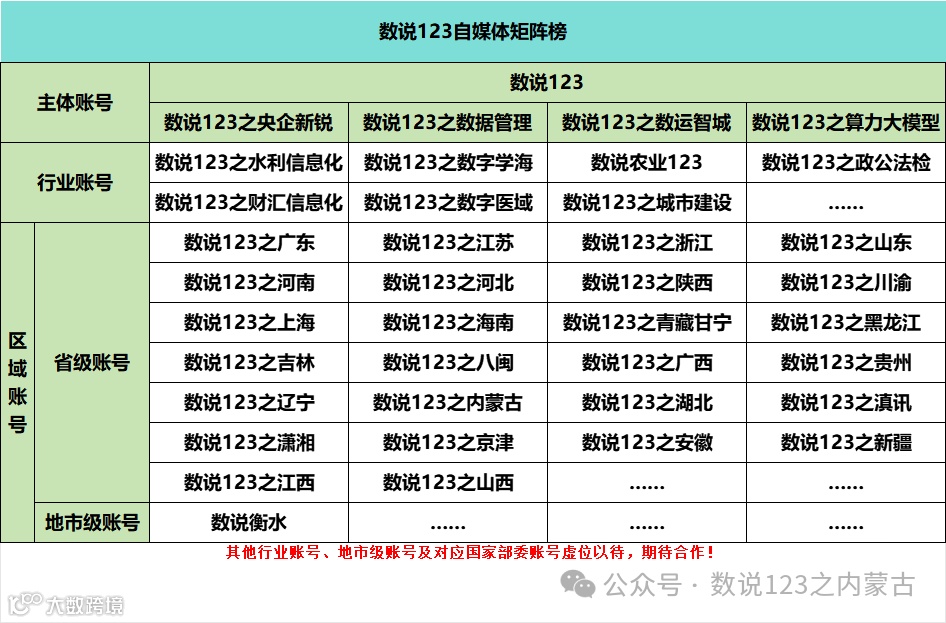 “数说123之内蒙古”是北京数说政通科技有限公司旗下自媒体矩阵“数说123”子账号,依托数据、情报、自媒体、资源为省、市、县三级数政局、运营商、国有数智平台公司、系统集成公司提供招投标数据定制、商机捕获、市场洞察、行业对标、生态与渠道建设、解决方案提供、自媒体宣传与账号运营等专业服务。