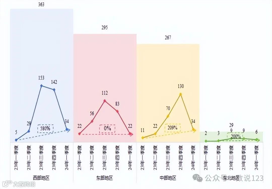 图 2-3 23 年一季度-24 年一季度四大经济区中标数量(单位:个)