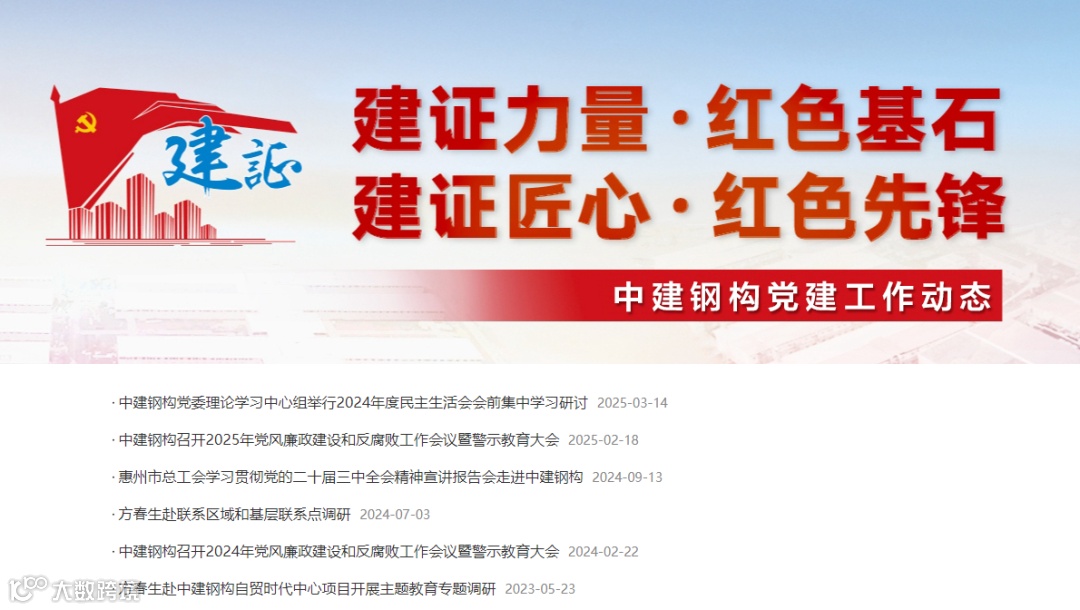 主要内容为中建钢构党建工作最新动态,通过及时展示公司党建成果,增强广大党员干部的参与感与荣誉感。