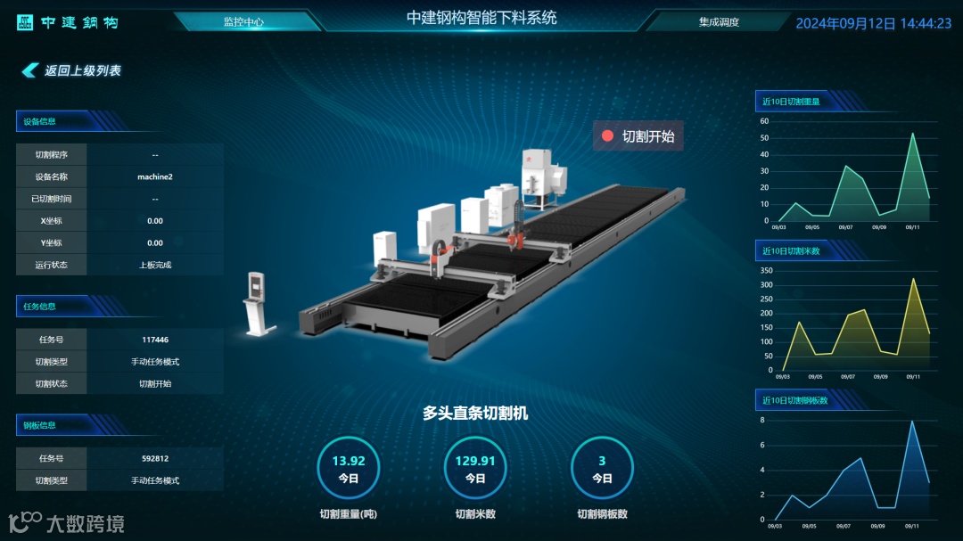 控制端可以实现设备数据采集和智能设备远程调度,只需一人即可管理整个车间的切割任务,实时统计分析下料车间的设备利用率和产量产能,实现下料车间智能化生产。