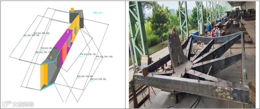 同时,设计团队在保证节点原则性要求不变的前提下,对节点内部构造进行调整并优化,解决了壶冠复杂节点施焊难度大、要求高等一系列加工、制作难题。面对“叶片”构件加工定位难问题,在保证构件及零件图精准的同时,通过对每个构件采用模型量尺出辅助图,再配合提供叶片单体三维坐标点,解决了构件高精度的制造加工问题。