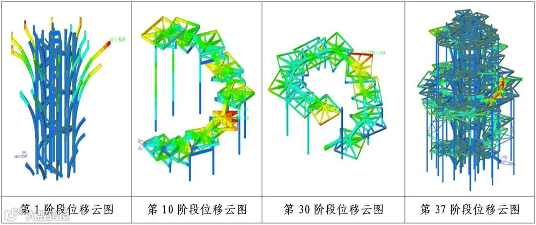 模拟计算主要采用有限元分析软件MIDAS,按照先枝干、后树叶、由内到外、先刚后柔的安装准则,将整个施工过程中共分37步进行模拟分析,确保了项目施工过程中结构性能指标处于可控范围,保障了施工安全。