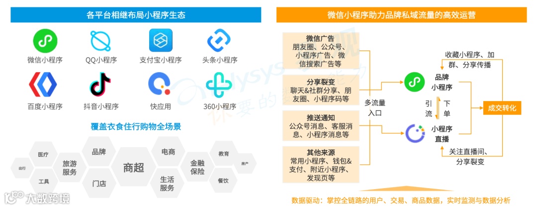 小程序,依托于各平台体系内多触点、多场景的流量来源以及在各平台的电商、直播、广告等能力的支持下,逐渐成为品牌进行私域流量运营的主要阵地。