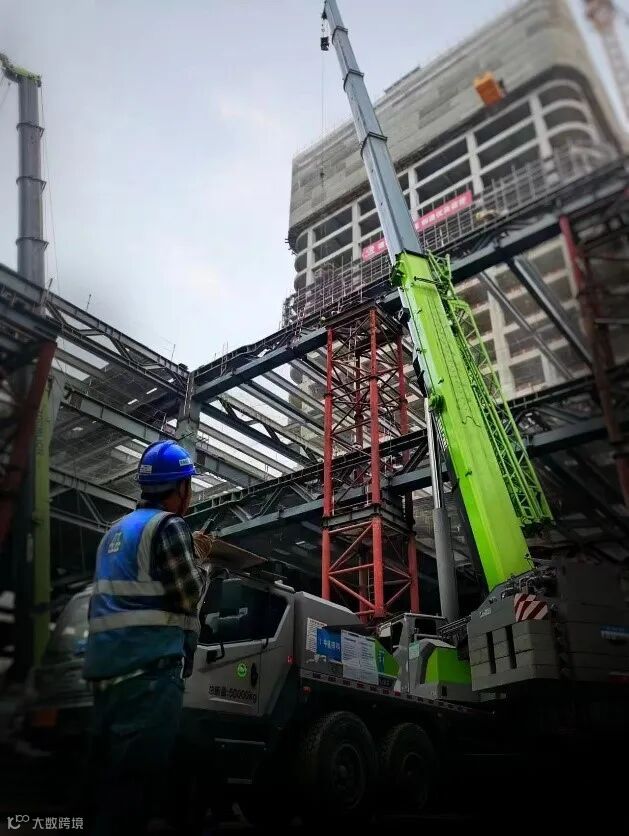 巨大的钢桁架在起重机的牵引下,缓缓升向高空
