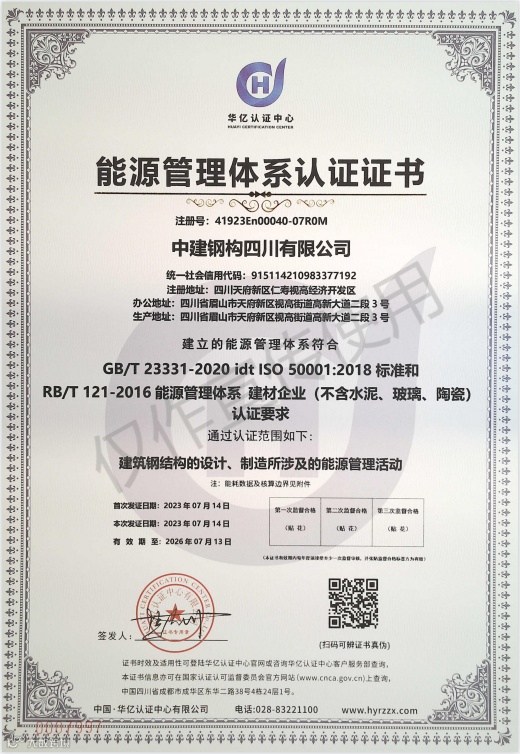 近日,中建钢构四川有限公司喜获温室气体排放核查、产品碳足迹核查、能源管理体系3项认证证书,标志着中建钢构在能源体系建设、助力“双碳”发展等方面又迈出了坚实的一步。