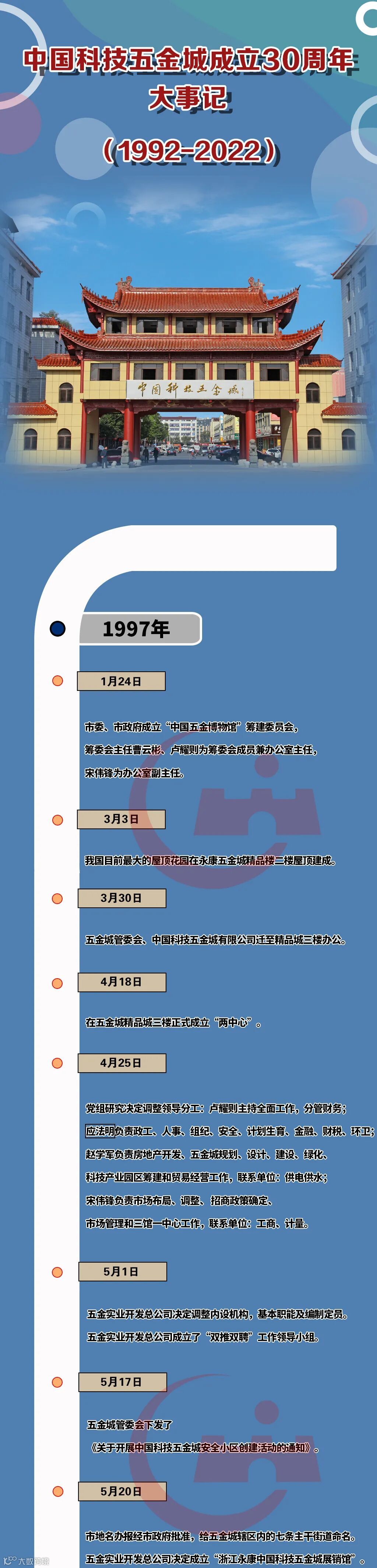 不忘来时路,走好前行路。为深化党史教育与企业发展史传承相结合,全面回顾中国科技五金城建设发展史,深刻了解中国科技五金城集团在上级党委的坚强领导下,敢为人先、奋勇开拓、勇立潮头,推动中国科技五金城从无到有、从小到大发展历程,传承中国科技五金城精神,奏响五金合声,凝聚推进企业改革发展新征程的强大力量,特编写“中国科技五金城成立30周年大事记”,每周发布一期,欢迎小伙伴们关注。