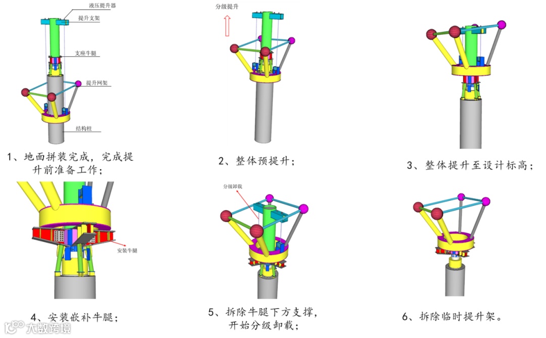 为确保安全建造,减少网架临时支撑,项目在钢网架提升过程中创新性应用同心环状提升节点,提升后该节点成为网架一部分,无需再高空拆补构件。
