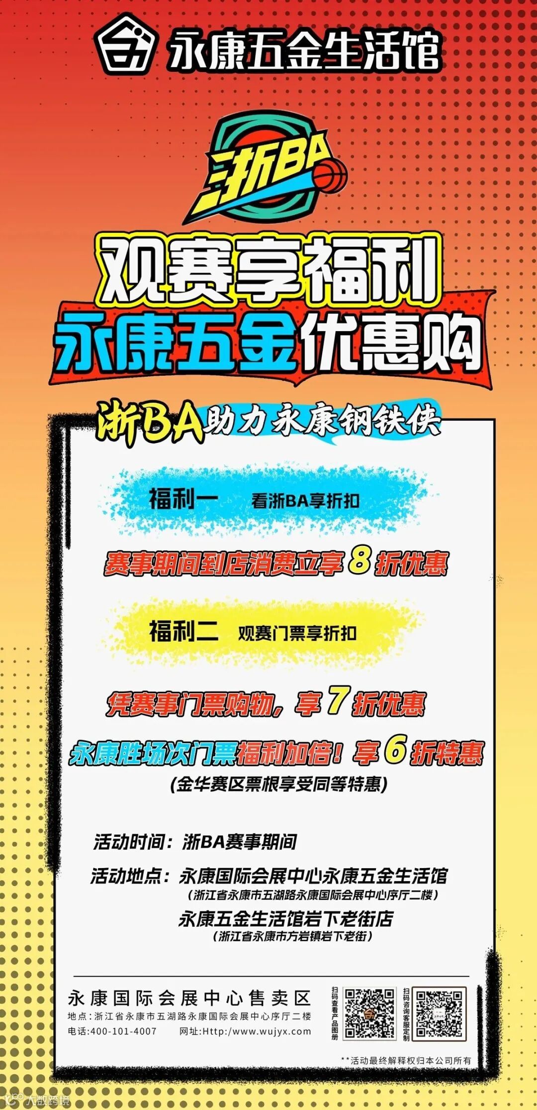 “浙BA”城市争霸赛激战正酣,永康五金生活馆推出“五金优惠购”活动,赛期全场直接8折,凭赛事票根立享7折,永康队获胜场次福利加倍,专属6折爽购。