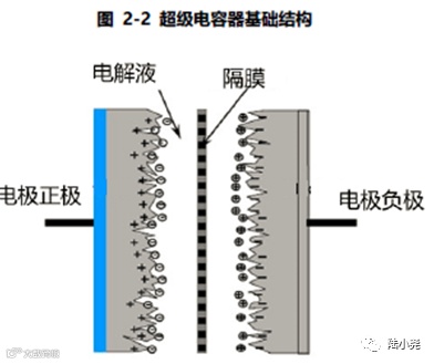 而超级电容则弥补了电池和电容的缺点。首先,超级电容中电介质的两侧充斥的是电解液,通电时电介质两侧聚集离子,形成双层电子结构。两个金属板之间的距离决定了超级电容的性能比普通电容、甚至电池更优。普通电容中,两个金属板之间的距离约为10-100微米,而超级电容中两个金属板的距离为一万分之一微米。距离的缩小意味着更大的电场,也就意味着更多的能量存储空间。同时,超级电容中金属板的碳涂层又增加了能量存储所需的表面积达10万倍,因此,和普通电容相比,所能存储的能量大大增加。