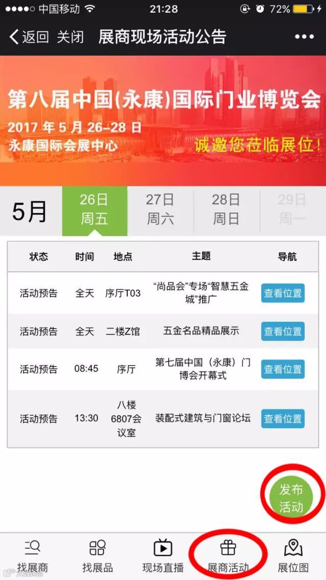 进入“门博会”栏目下的“展商活动”查看活动信息,点击“发布活动”进行发布。