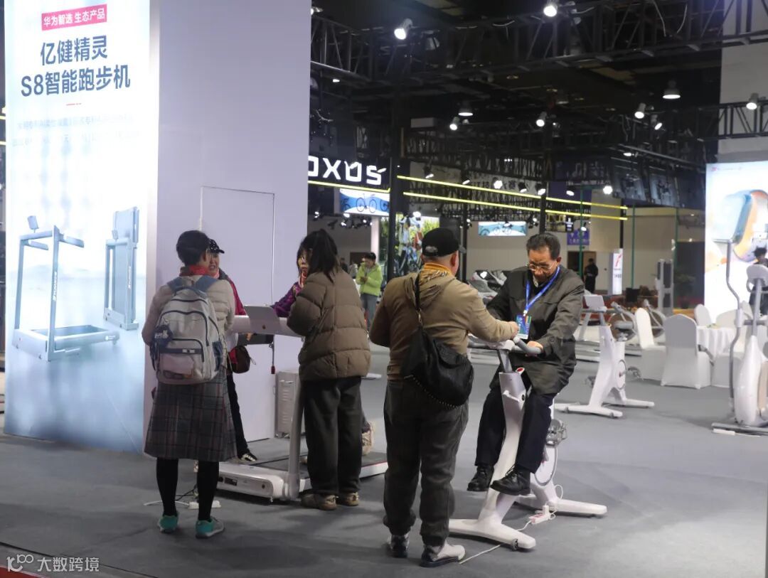 在亿健品牌展位上,展出了多款数字智能产品与华为智选专区,“华为智选生态合作伙伴”“智能跑步机”等特色亮点,吸引了不少参观者和客商前来体验、咨询。