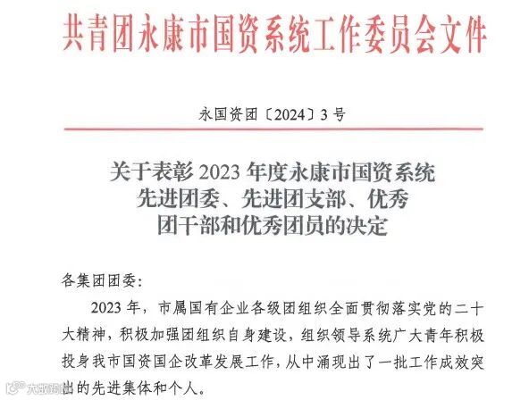 近日,市国资系统印发《关于表彰2023年度永康市国资系统先进团委、先进团支部、优秀团干部和优秀团员的决定》,五金城集团团委荣获2023年度“永康市国资系统先进团委”,五金城集团电商团支部荣获“永康市国资系统先进团支部”,吕晓东荣获“永康市国资系统优秀团干”,卢灵倩、胡梦瑶荣获“永康市国资系统优秀团员”。