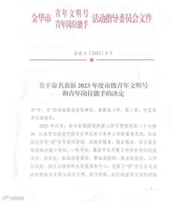 近日,金华市“双争”活动指导委员会办公室发文公布的2023年度市级青年岗位能手名单中,五金城集团会展公司办公室卢美玫荣获“青年岗位能手”荣誉称号。