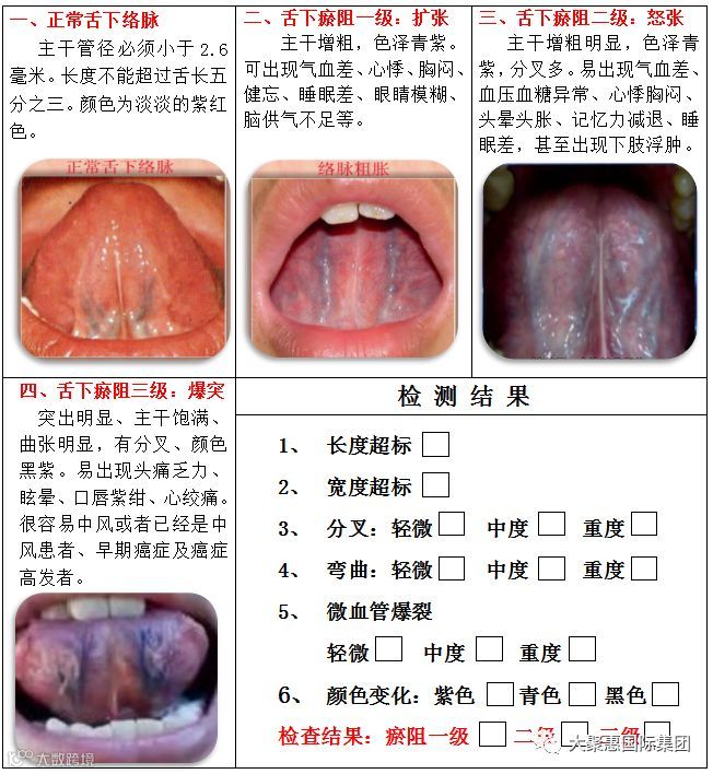 舌下络脉(静脉)是回流心脏之途径,如果出现严重瘀堵,最终可能导致脑供氧不足、脑中风 、眼底动脉缺血、左心室肥大 (压力变大)、心梗等严重后果,检查舌下瘀阻是中医诊断疾病、提前预防中风、癌症等严重后果的一种有效方法。