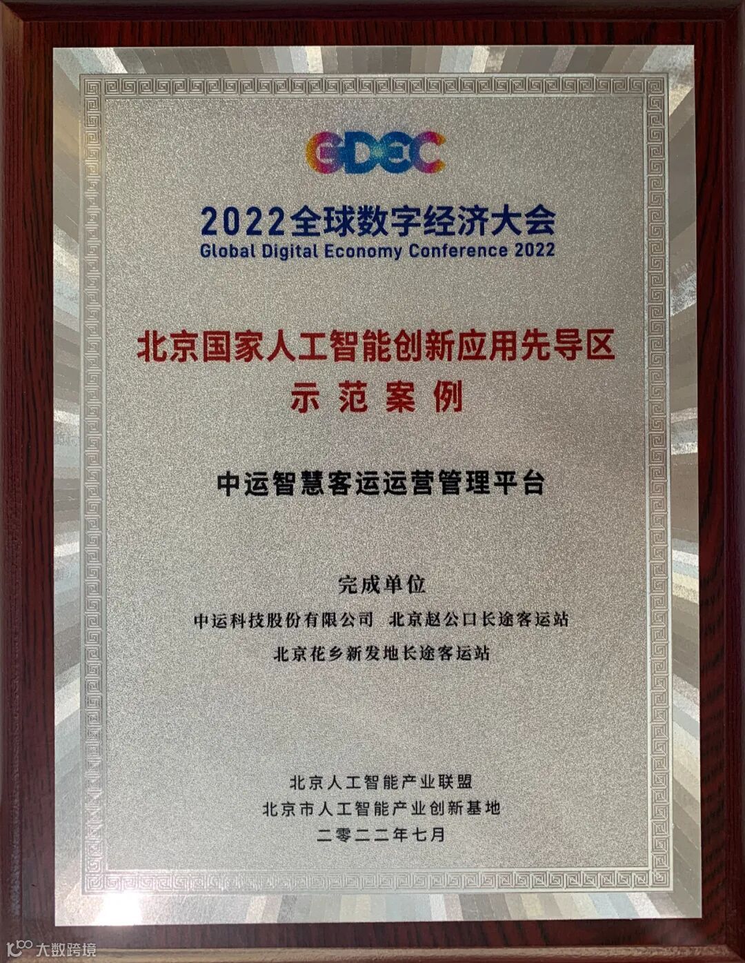 2022全球数字经济大会人工智能专场论坛上发布的“北京国家人工智能创新应用先导区示范案例”中,中运科技申报的“中运智慧客运运营管理平台”成功入选,并收录至《北京国家人工智能创新应用先导区示范案例集》。
