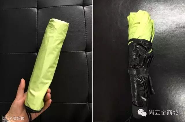 这是雨伞的外包装,嫩嫩的果绿色,一种很清新自然的颜色。外面是正常的雨伞材质的布料,里面有一层防晒涂层,既可以挡雨防淋湿,又可以遮阳防紫外线。