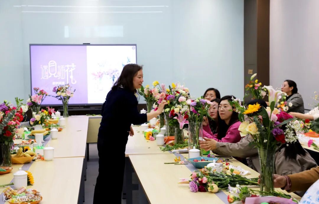 插花培训现场,集团人力资源中心副总监为大家讲授如何选花、养护、颜色搭配、造型等插花技巧,现场演示制作层次分明、错落有致的插花艺术品,在她细心指导下,大家动手尝试修剪枝叶,精心搭配不同色彩的花朵,一件件花卉艺术品在兰心蕙质的女神们巧手下一一呈现,展现了女神们多才多艺、心灵手巧的巾帼风采。