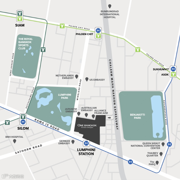 地处曼谷市中心的巴吞旺区 Rama 4 路与 Wireless Road 的交汇处,与曼谷的主要商圈 Sathorn、Silom 和 Samyan 等串联起来,且邻近 MRT Lumpini 站(步行约 2 分钟)和 BTS Ploenchit 站(设有免费穿梭巴士),交通十分便利。