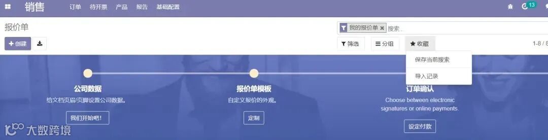 默认情况下,订单列表视图界面的收藏里是没有多余选项的。我们下面建立一个简单的筛选,将订单金额合计超过2000元的查找出来并且进行收藏,这样以后就可以在订单界面点击收藏的筛选条件关键词就可以快速得把合计金额大于2000元的订单筛选出来,方便查找。
