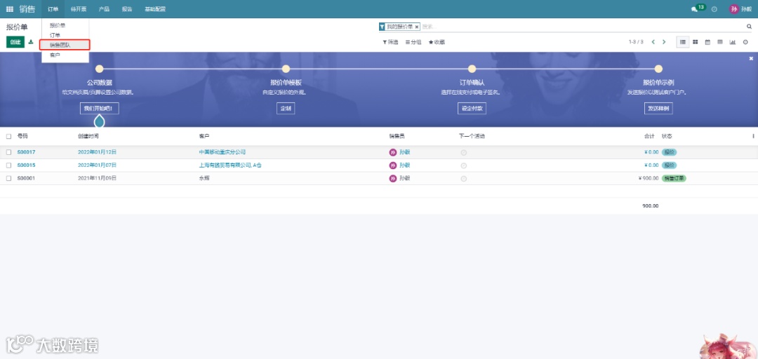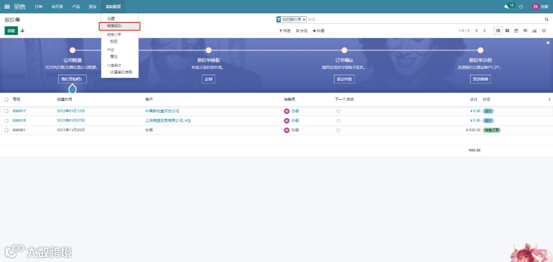 首先要在销售模块中配置销售团队