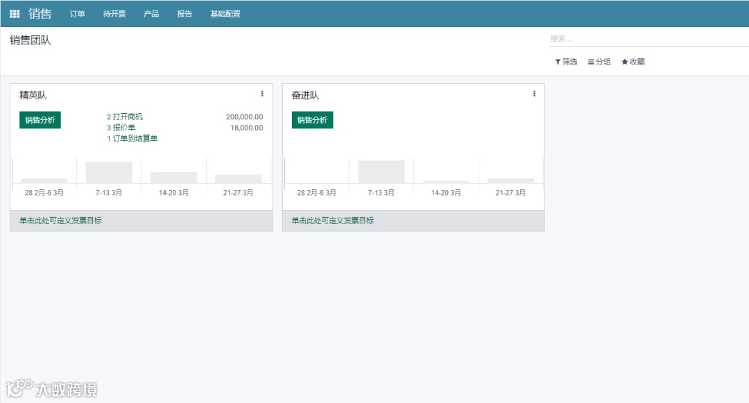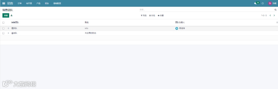 在进入销售模块后,选择“销售团队”菜单后,您将进入销售团队窗口