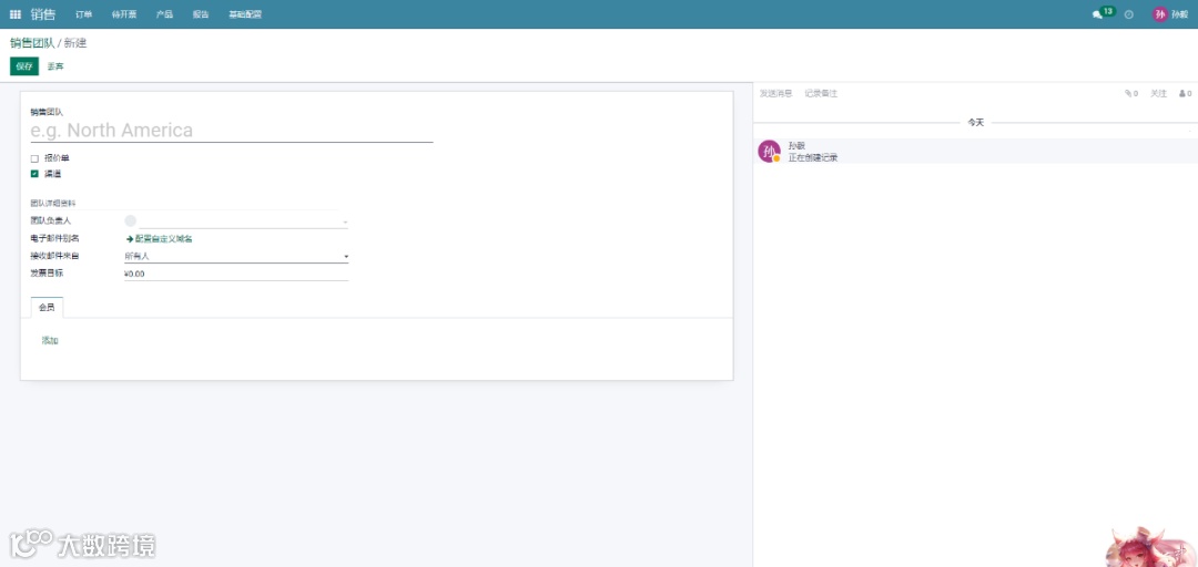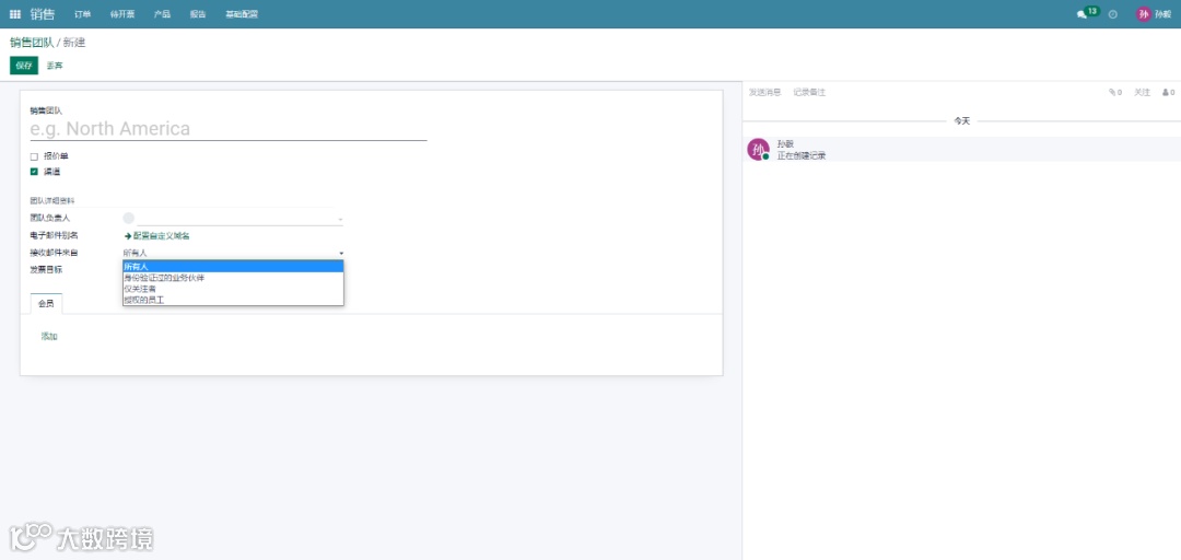 如果您将权限设置为每个人,则销售团队中人人都可以发布消息。如果将该字段设置为“身份验证过的业务伙伴”,则只有经过身份验真的合作伙伴才能使用邮件网在文档上发布消息。使用“仅关注者”选项,只有相关文档的关注着或一下频道的成员才能发布消息,也可以只用于发布授权员工。提供这些字段后,如果您有多个公司,您就可以与此销售团队所关联的公司相绑定。发票目标选项允许您设置当月的收入目标金额,这是已确认发票的未税总额,简而言之,发票目标就是销售团队预计在当月开票的总金额。