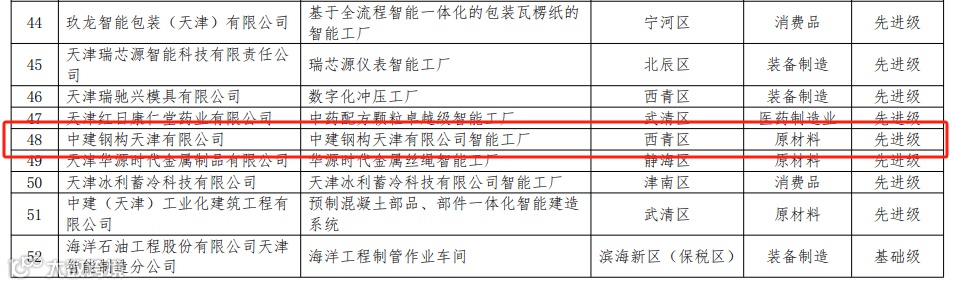 近日,天津市工业和信息化局公示一批先进级和基础级智能工厂,中建钢构天津有限公荣获2024年天津市先进级智能工厂称号。