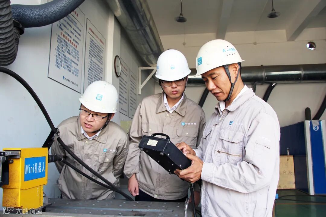 栾公峰(左一)查看焊接机器人使用情况